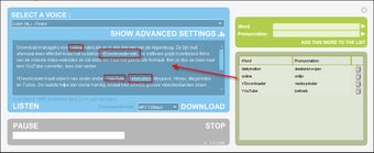 Acapela-Box is een fraai ontworpen website met prettige kleuren, schattige logo's en duidelijke knoppen. Je typt of plakt een lap tekst in het centrale veld. Hierna selecteer je taal en stem: Acapela-Box ondersteunt veel talen en biedt mannelijke en vrouwelijke stemmen met zowel Nederlands als Vlaams accent. Hoewel de stemmen duidelijk zijn, gaat niet alles van een leien dakje. Gelukkig bewerk je via de Advanced Settings de uitspraak van bepaalde woorden (denk aan: 'joetoeb' voor YouTube).