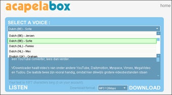 Acapela-Box is een online 'text to speech' applicatie. De dienst leest ingevoerde tekst op in allerlei talen, waaronder Nederlands. Je probeert Acapela-Box gratis en met een betaalaccount download je de audio ook als mp3'tje.
